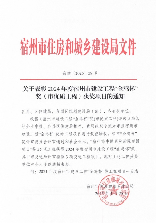 榮獲2024年度宿州市建筑工程“金雞杯”獎